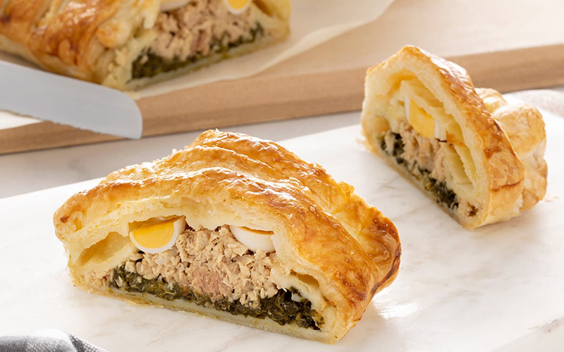 Fusión entre empanada y Wellington, este hojaldre de atún es tan resultón como apetitoso. Además, no te cansarás de prepararlo a menudo por la sinfonía de aromas que invade la cocina y por la buena acogida que cosecha cada vez que llega a la mesa. En cuestión de minutos… ¡no queda ni una miga!